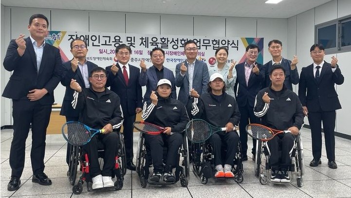 [충주=뉴시스]연종영 기자 = 장애인 휠체어 테니스팀을 만든 이차전지 양극소재 기업 재세능원과 장애인 고용·체육 진흥업무를 담당하는 3개 기관이 16일 MOU(업무협약서)를 체결했다.