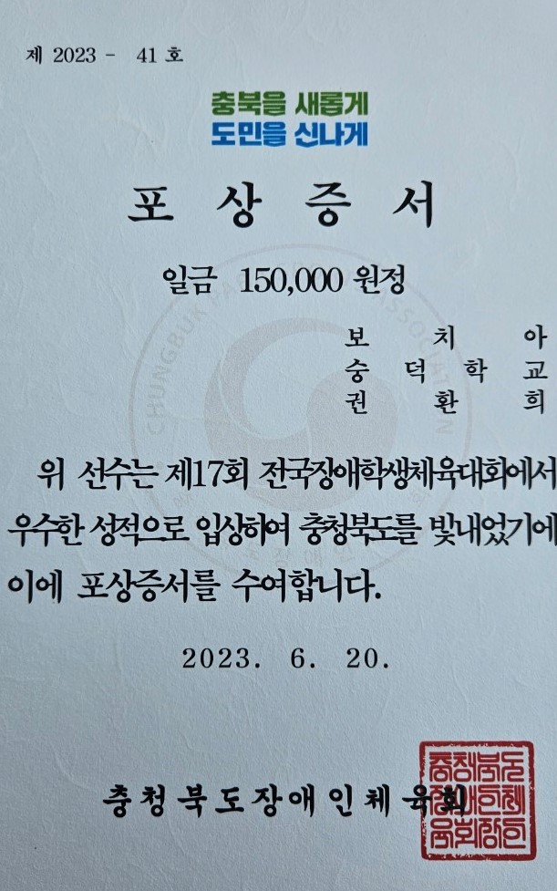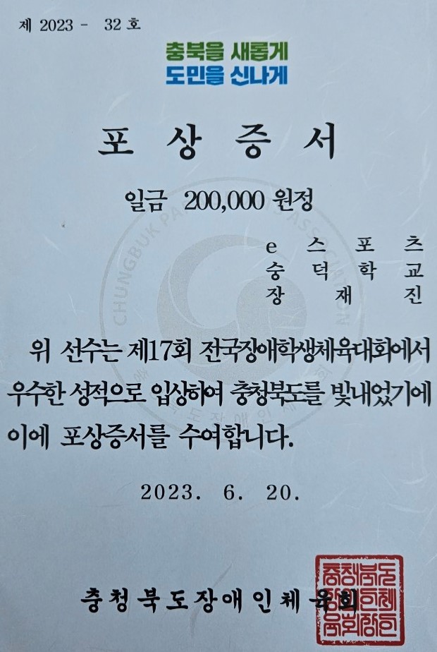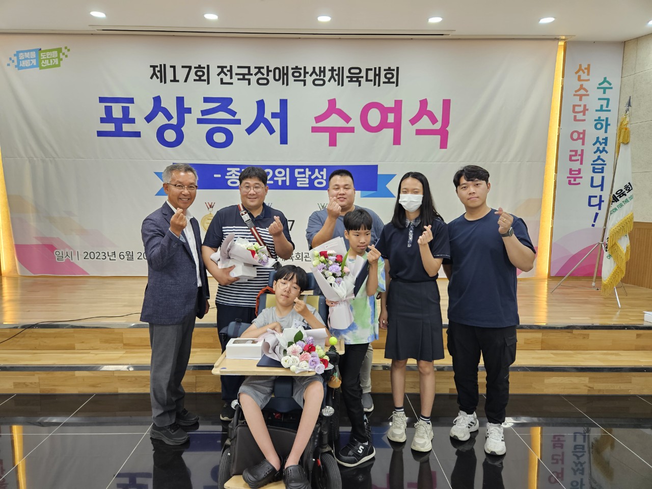 제17회 전국장애학생체육대회 해단식 일시 : 2023.06.20.(화) 14:00 ~ 장소 : 청주 충북체육회관 1층 내용 : 학생체전 출전하여 메달 획득한 충주시 선수단 포상증서 및 포상금 전달