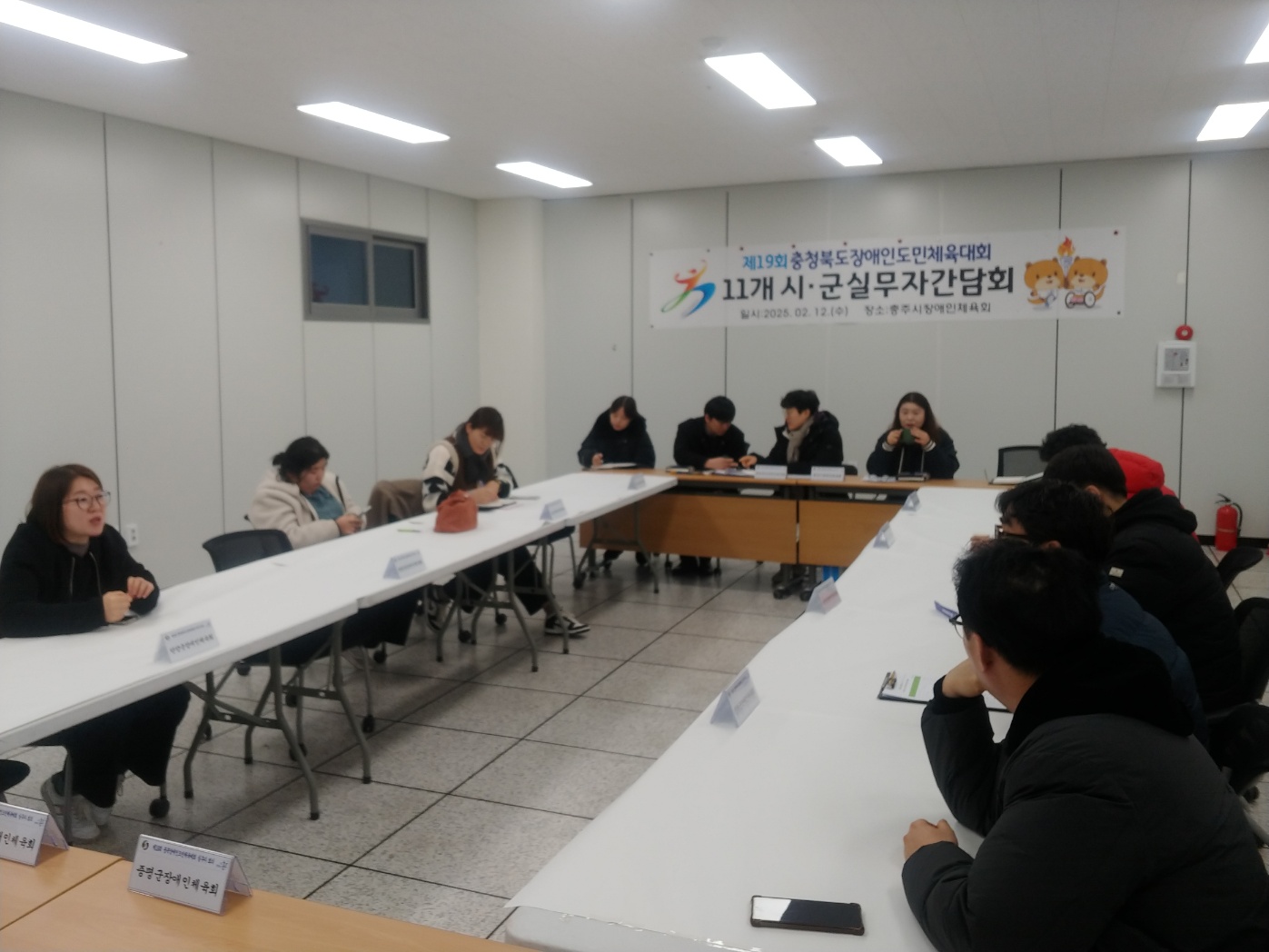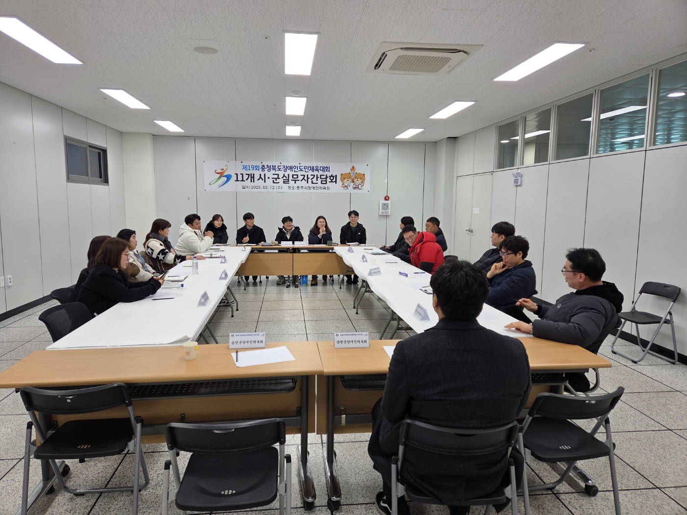 제19회 충청북도장애인도민체육대회 11개시군실무자간담회 일시 : 2025. 02. 12. 10:00 ~ 14:00 장소 : 충주 종합운동장 충주시장애인체육회 사무실 인원 : 11개시군 장애인체육회 도민체전 실무자 내용 : 제19회 충청북도장애인도민체육대회 관련 회의
