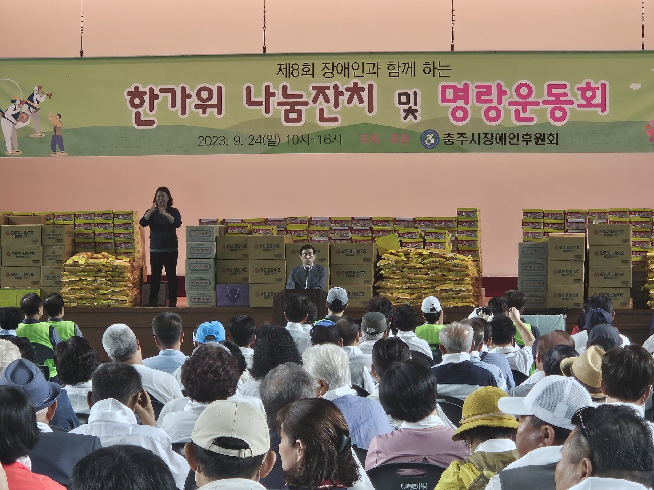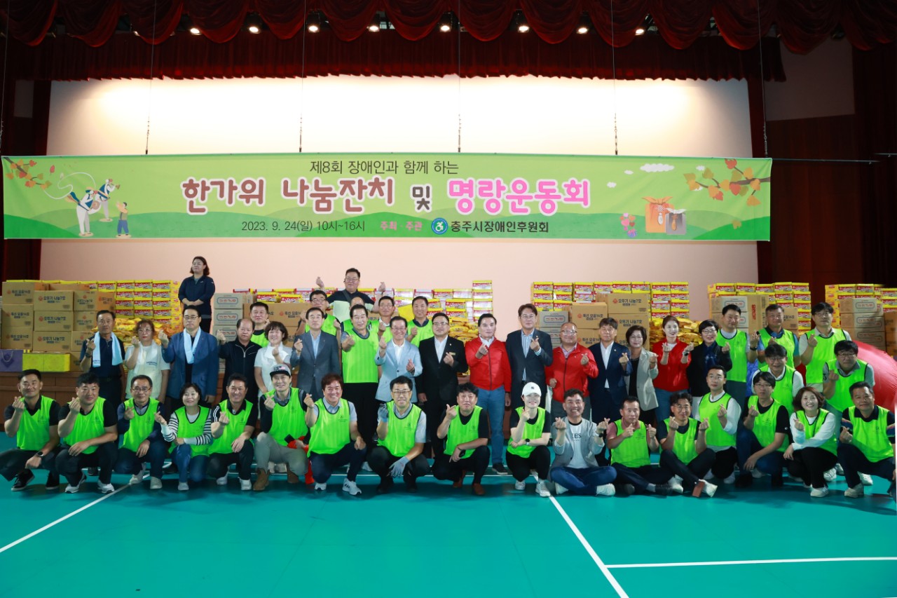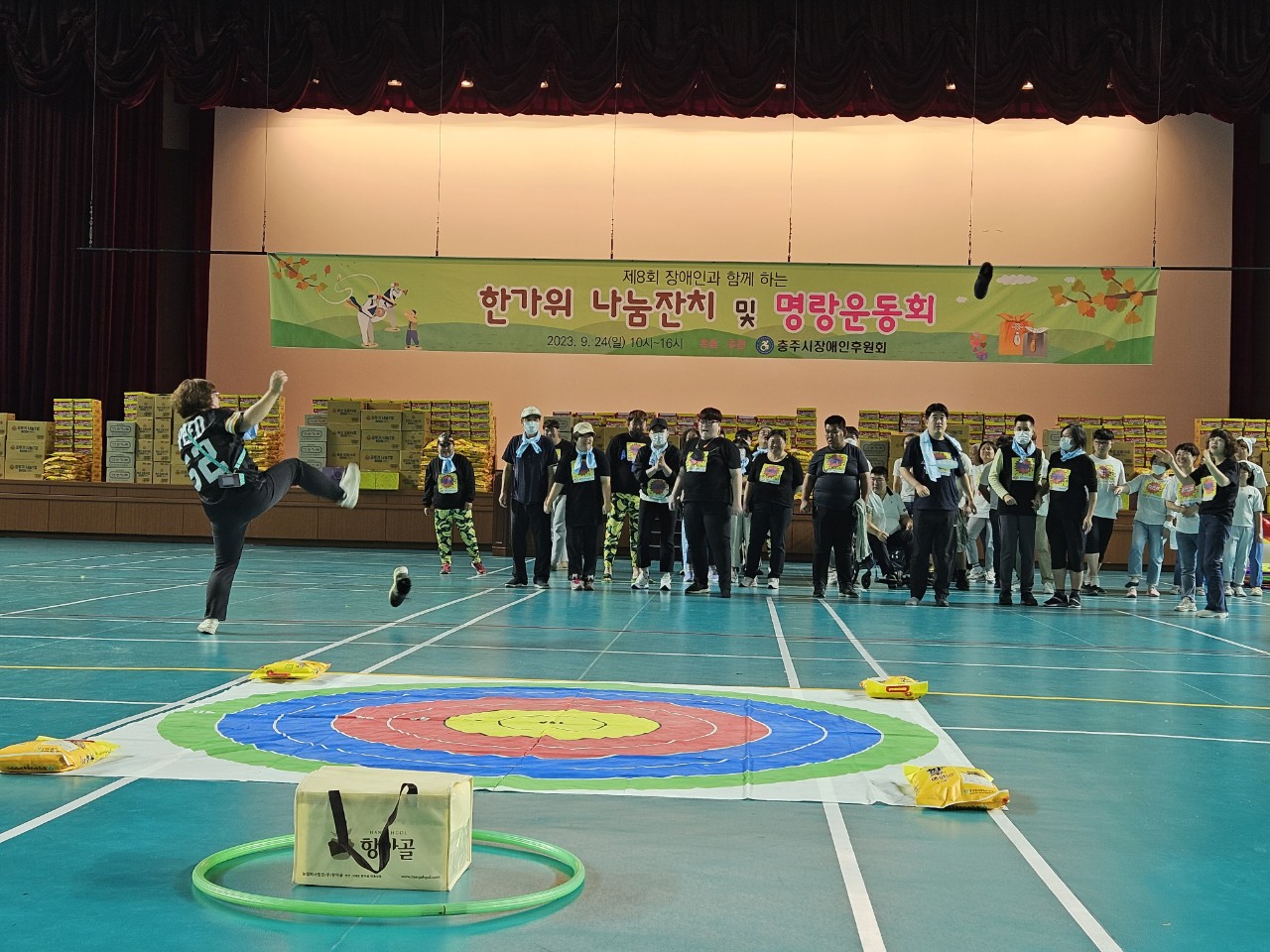 제8회 한가위 나눔잔치 및 명량운동회 일시 : 2023. 09. 24.(일) 10:00 ~ 장소 : 충주 호암체육관 대상 : 충주시 지체, 농아, 시각, 신장 부모회 등 장애인 450여명