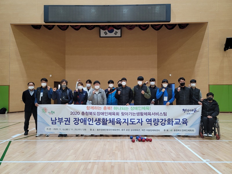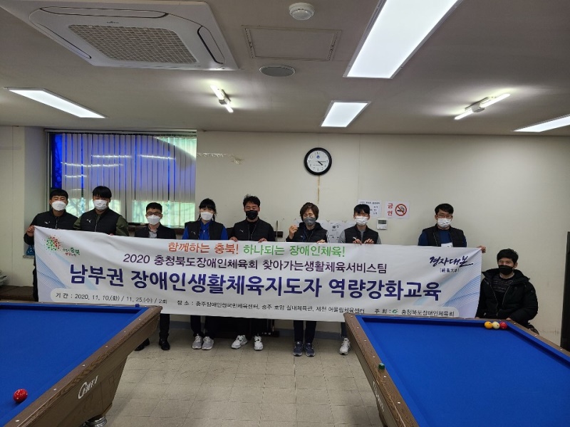 2020 충청북도장애인체육회 찾아가는생활체육서비스팀 남부권 장애인생활체육지도자 역량강화교육 기간: 2020. 11. 10(화) 장소: 충주: 충주시장애인체육센터, 호암체육관 인원: 지도자 6명 내용: 보치아(이론 및 실기) 10:00~12:00 당구(이론 및 실기) 14:00~16:00 |