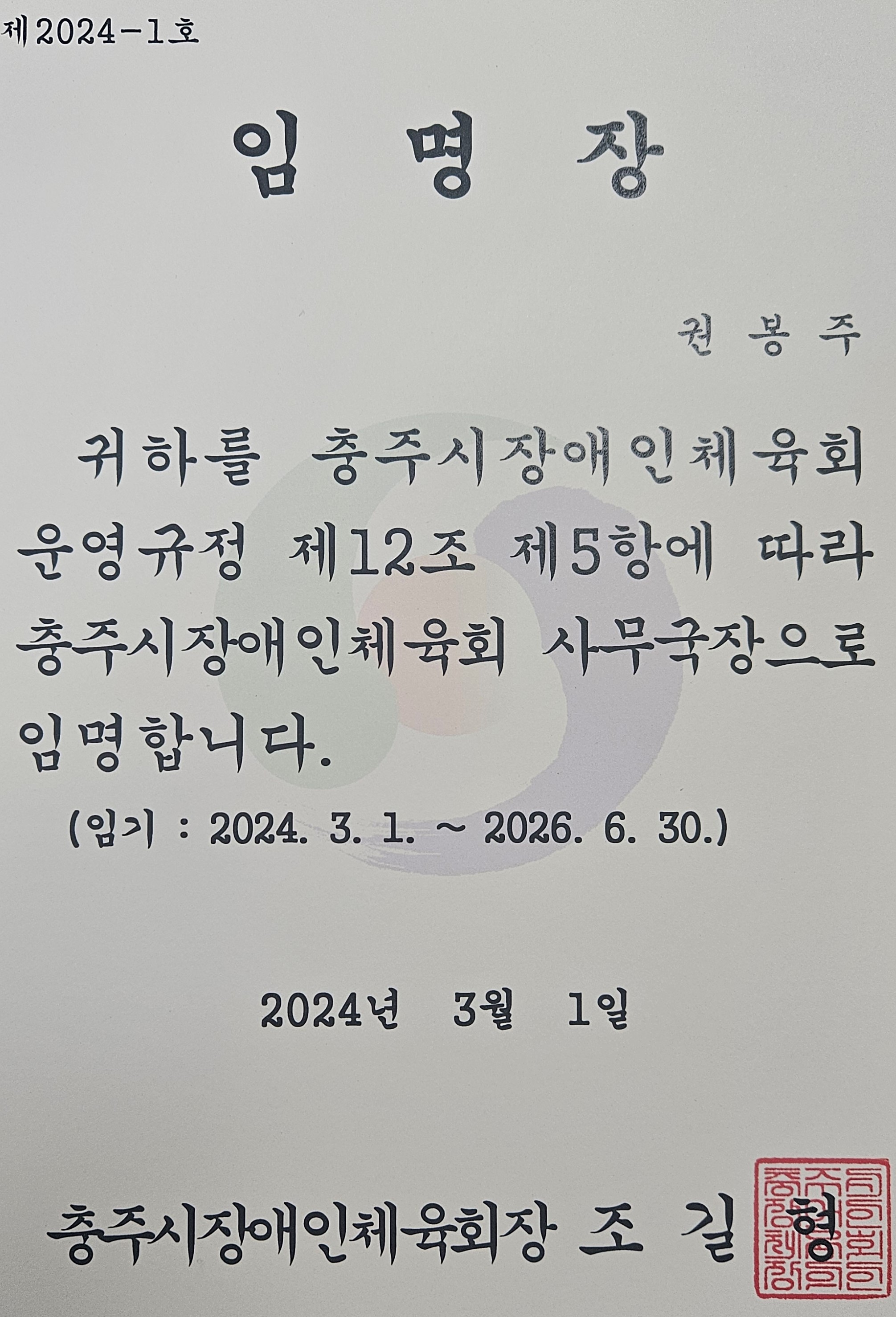 2024. 충주시장애인체육회 사무국장 임명식 일시 : 2024. 02. 29.(목) 14:00 ~ 장소 : 충주종합운동장 8번게이트 충주시장애인체육회 사무국 인원 : 사무국장 권봉주 임기 : 2024. 03. 01. ~ 2026. 06. 30)
